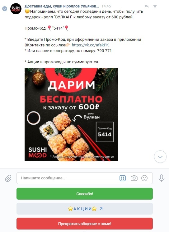 Первый, и самый очевидный, шаг - реанимировать старых клиентов, которые подписаны на сообщество Sushi Mood или ранее уже заказывали доставку.